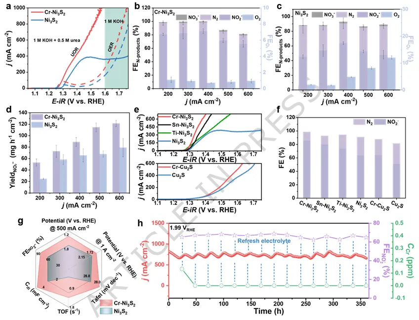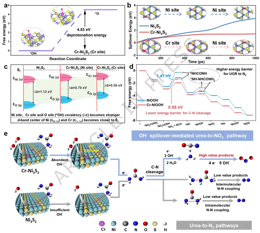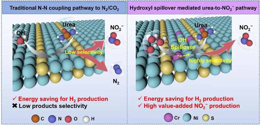 针对上述瓶颈,内蒙古大学刘健教授和王艳琴副教授、郑州轻工业大学巩飞龙副教授(共同通讯作者)等人提出了一种"羟基泵"催化策略。研究团队巧妙地在硫化镍(Ni₃S₂)晶格中引入铬离子(Cr³⁺)作为路易斯酸位点,利用其对羟基的强亲和力构建动态溢流通道——如同搭建了一条分子级输水管道,将富集的羟基持续输送至相邻的镍活性位点。结合先进的光谱学与理论计算,研究证实这种溢流效应不仅加速了高活性镍氧物种的生成,更重要的是重构了反应能垒:它像一位精准的"交通警察",引导尿素分子走向亚硝酸盐的生成路径,同时阻断通往氮气的分叉路口。该催化剂在工业级电流密度下展现出卓越的亚硝酸盐产率与稳定性,并将电解制氢的能耗显著降低,为废水资源化与绿色化工生产开辟了一条兼具经济价值与环境效益的新途径。