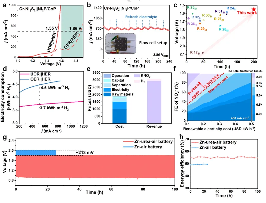 该研究通过精准构筑Cr³⁺路易斯酸位点掺杂的Ni₃S₂电催化剂(Cr-Ni₃S₂),创新性地揭示了路易斯酸-碱相互作用驱动的羟基溢流(OH⁻ spillover)机制——Cr³⁺作为"羟基泵"动态捕获并溢流离羟基至邻近Ni位点,既加速了高活性NiOOH物种的原位生成,又通过优化C-N键断裂与抑制N-N偶联的竞争动力学,实现了尿素选择性电氧化制亚硝酸盐(NO₂⁻产率达120.98 mg h⁻¹ cm⁻²,法拉第效率>85%)与节能制氢(能耗降至3.7 kWh m⁻³H₂)的协同耦合。该策略不仅显著降低了锌-尿素-空气电池的充电过电位(288 mV),且技术经济分析证实其具备工业级盈利潜力($1,210.5/吨尿素),更为广义层面设计选择性电催化体系提供了"通过路易斯酸位点调控反应微环境"的普适性范式。未来研究可进一步拓展至其他硬路易斯酸(如Ti⁴⁺、Sn⁴⁺)及多元异质结基质,深化对溢流动力学与反应路径选择性的理论认知,推动工业废水高值化利用与分布式绿色氢能技术的规模化应用。