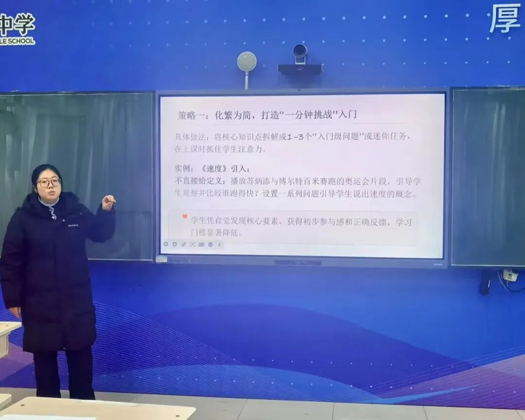 政治学科青年教师分享了贴合学情的教学方法。吕冰倩老师认为,构建尊重平等的师生关系是提升学科兴趣的关键,同时注重情境教学,将抽象政治理论与生活结合,让枯燥知识变得生动可感;牛要涛老师强调基础知识的重要性,主张严抓背诵过关,在过关中拉近师生距离,提升学生学习主动性。物理学科宋运洁老师结合学生学习难点,建议教学从“教知识”向“教参与”转变,化繁为简,引导学生主动探索。