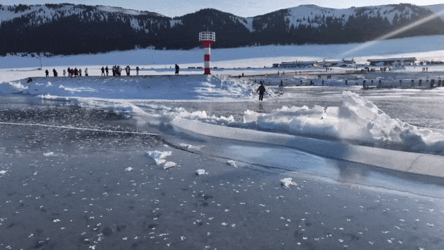 下午:抵达赛里木湖(“大西洋最后一滴眼泪”),换乘景区区间车游览,打卡深冬限定蓝冰、冰泡泡(冬季赛里木湖湖面结冰,呈现出纯净的湛蓝色,冰下气泡清晰可见,随手拍都是大片),慢慢游玩、沉浸式感受冰湖美景,玩够2.5小时;
