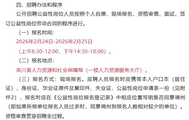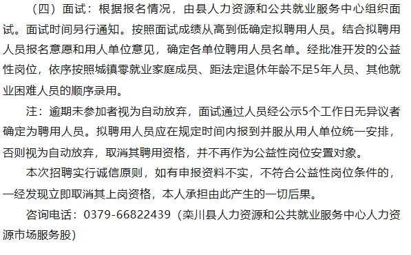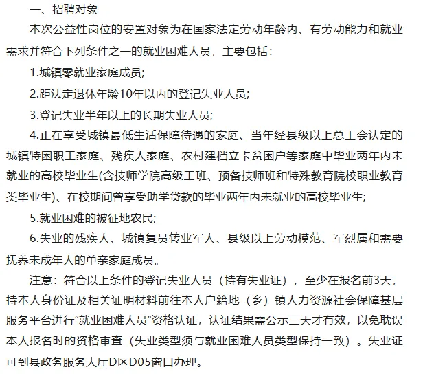 为促进就业困难人员就业,搭建供需双方对接平台,根据《河南省人力资源和社会保障厅河南省财政厅关于印发河南省公益性岗位管理办法的通知》(豫人社办〔2020〕23号)、《洛阳市公益性岗位开发管理实施细则》(洛人社〔2020〕25号)及《洛阳市人力资源和社会保障局关于确定洛阳市2026年城镇公益性岗位开发计划的通知》(洛人社就业〔2026〕1号)文件精神,现将栾川县公益性岗位招聘有关事宜公告如下: