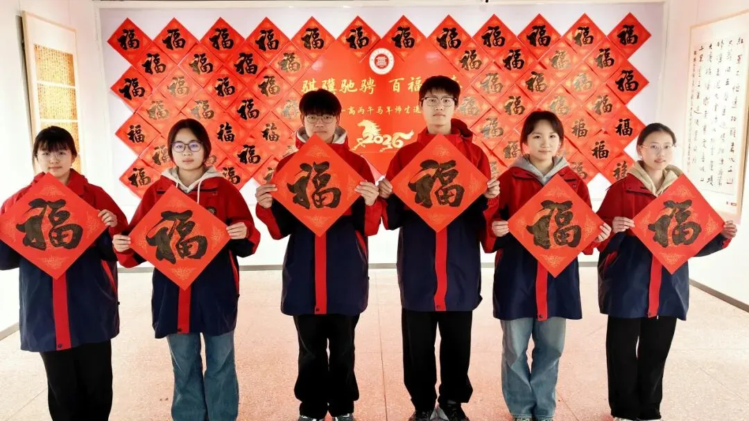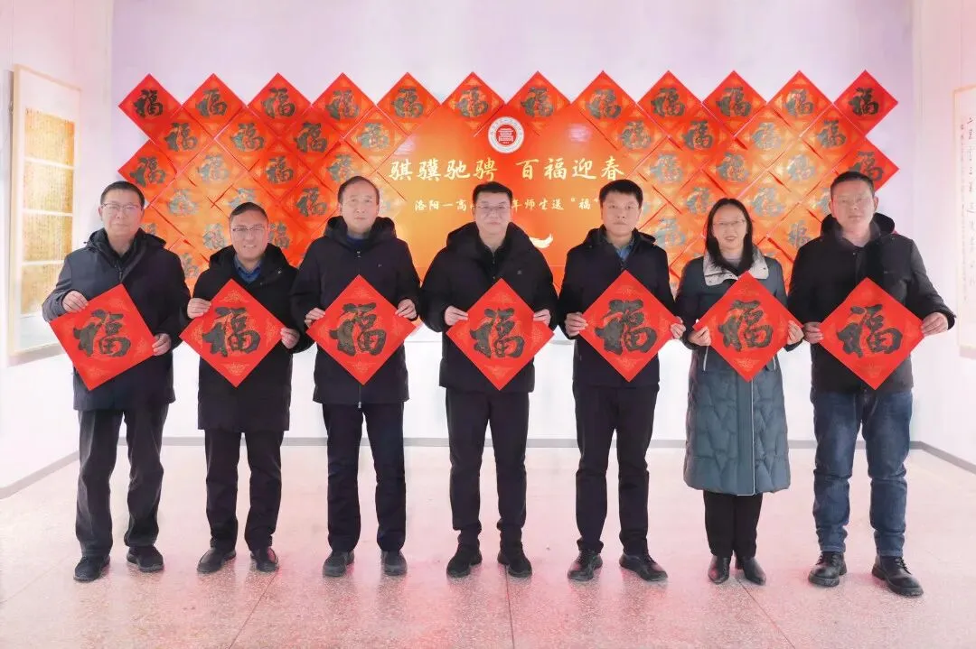 笔锋流转间,“ 骏马腾云承远志,书香满园育英才““策马书山寻雅趣,扬帆墨海探真知”等立足校园文化、寄语莘莘学子的春联,以及一个个饱满圆润、遒劲有力的”福“字跃然纸上,既饱含对新春的期盼,也彰显着洛阳一高的文化底蕴与育人初心。