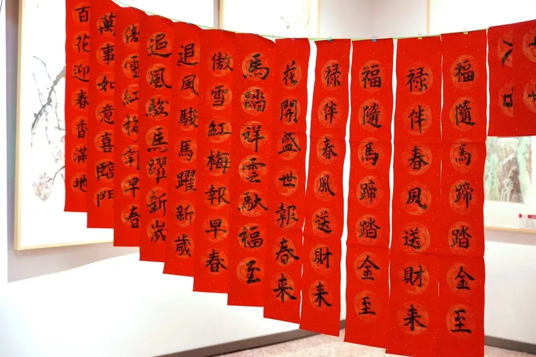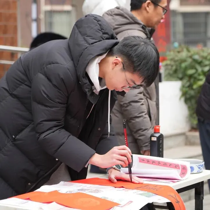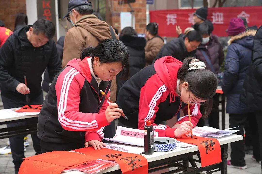 师生们耐心询问居民的需求与偏好,或量身定制春联内容,或现场书写寓意吉祥的经典佳句,一撇一捺间尽显书法艺术的独特魅力,一字一句里承载着对美好生活的向往。