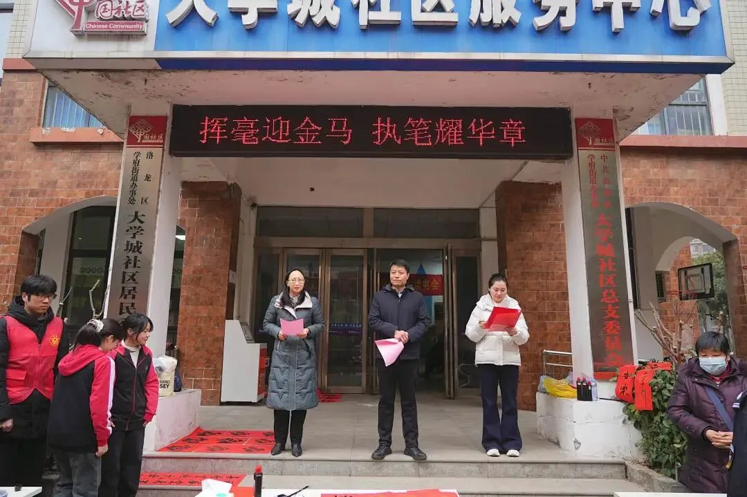 走出校园,情暖社区。洛阳一高师生书法爱好者曹雪玲、郭龙伟、陈新升、余雪雷等组成的“送福小分队“奔赴大学城社区,将新春祝福延伸至社区一线。活动现场早早就围满了前来领取春联的居民,大家脸上洋溢着期待的笑容。