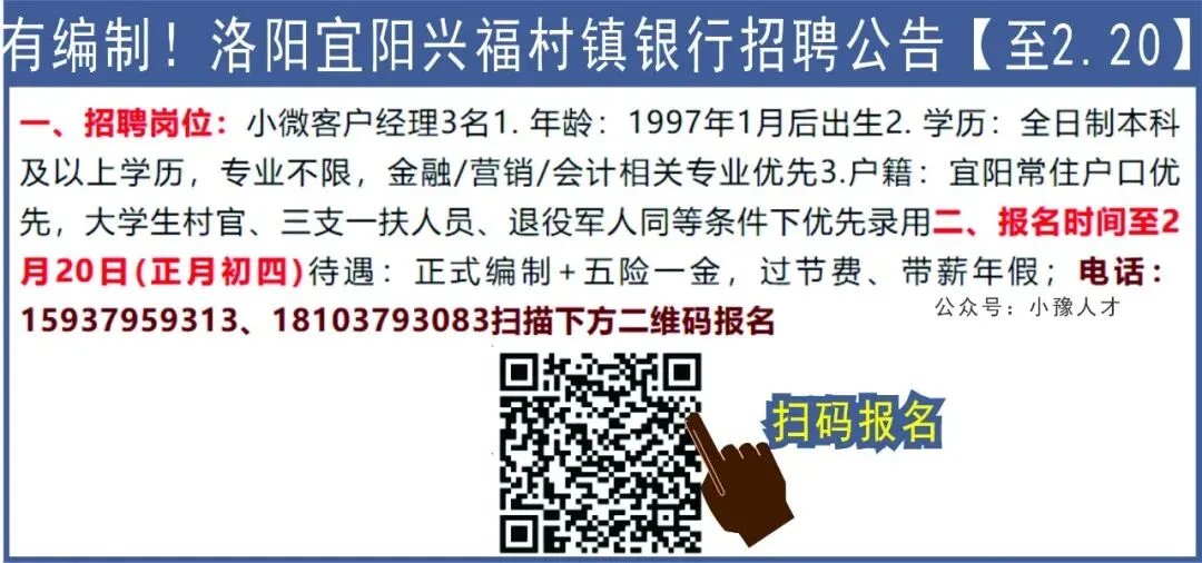 >有编制!洛阳宜阳兴福村镇银行招聘公告【至2.20】