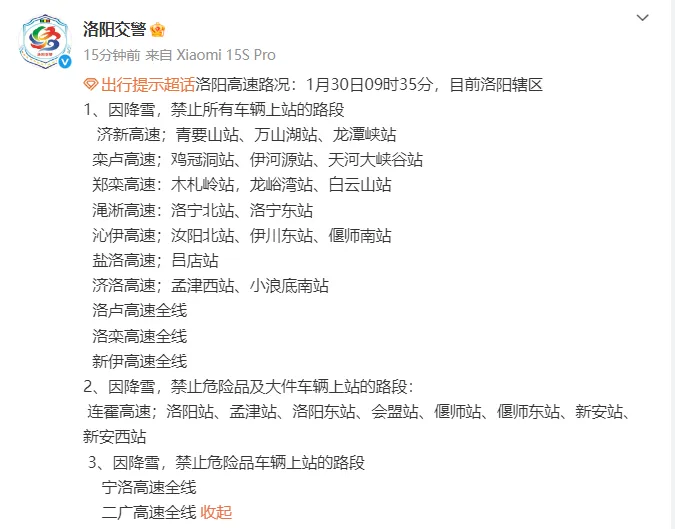 洛阳高速路况:截至2026年1月30日09时35分,洛阳辖区