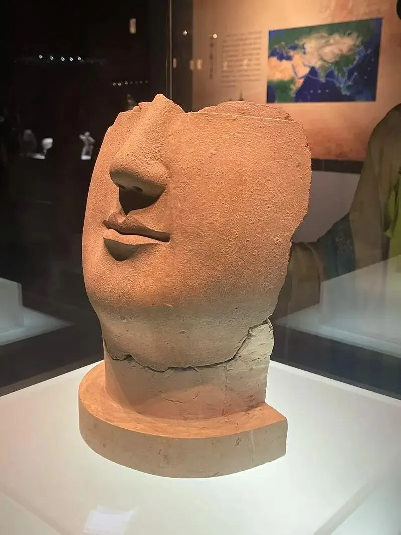 泥塑佛面像是北魏时期雕塑文物,出土于洛阳永宁寺塔基遗址,这具佛面像是一具残像,高约25厘米,唇部线条清晰饱满,考古研究推算,若佛像呈站立姿态,整体高度可达3米,为永宁寺遗址已知规模最大的佛像,造像面部轮廓舒展光洁,嘴角微扬的神态展现出北魏佛像特有的圆润气质,反映了孝文帝改革后佛教本土化的艺术特征,被誉为“东方的蒙娜丽莎”。永宁寺木塔原高约136米,公元534年毁于雷击引发的大火,佛面像因体积较小得以在火灾中存留。