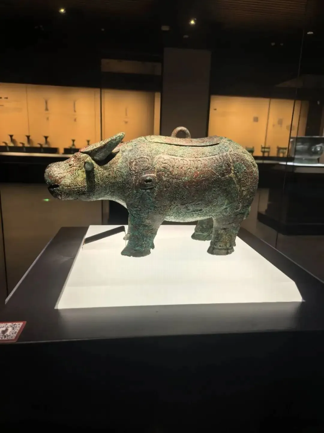 亚长牛尊,其实近看这个青铜器还是蛮可爱的,没有想象中那么大,身上雕刻着花纹,记得好像说有龙纹和虎纹之类的,很精美,其实看起来也是憨憨的感觉,由此还看到了这个时期青铜器的铸造方式,不再是分部分铸造后焊接在一起的,而是整体的铸造,看起来还是挺复杂的,我们出了这个展馆后,又看了一下网上的视频才搞懂怎么一回事。