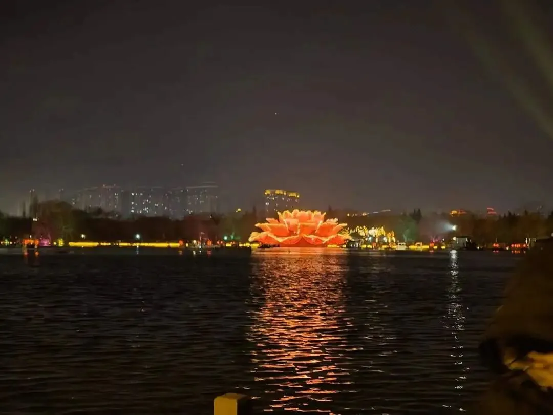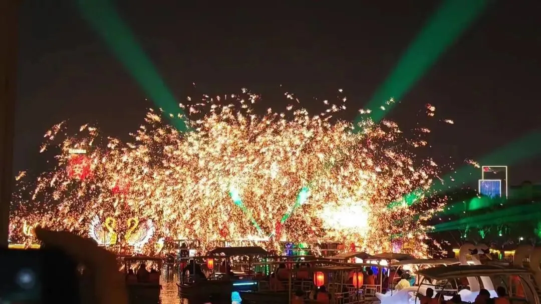 人们走在滴翠湖边,欣赏着传统艺术“打铁花”