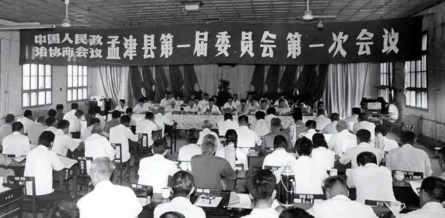 图中这一屋子的桌椅方凳摆得整整齐齐,黑底白字的大横幅在顶上横着挂,老胶片的颗粒感一出来,庄重味儿就到了,爷爷指着说,那会儿会场里只有两台电风扇慢慢转,窗外的杨树叶哗啦啦,大家一杯白瓷缸茶,从上午坐到下午,事儿都在台上讲开了.