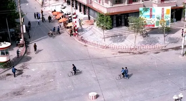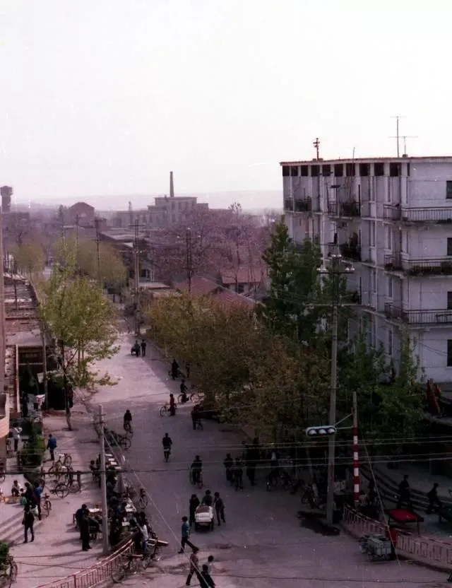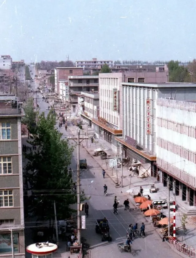 这一带是老县城的热闹心口,图上能看见红白相间的路桩,马车靠边停着,自行车像一串黑豆往前滚,街角的小摊撑了橙色伞面,买凉皮的、修车的都在这儿扎堆,妈妈说,那时五分钱一碗绿豆冰棍,骑车路过顺手就买,甜到心尖.