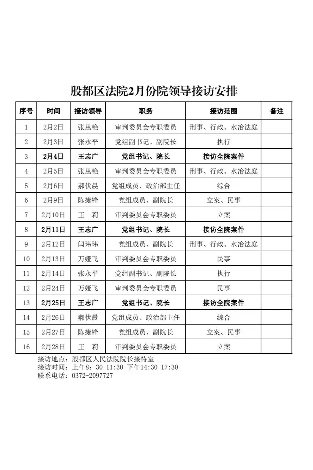 为认真贯彻落实院领导接访制度,进一步畅通群众信访渠道,依法及时解决群众合理合法诉求,现将殷都区人民法院2026年2月份院领导接访信息公示如下: