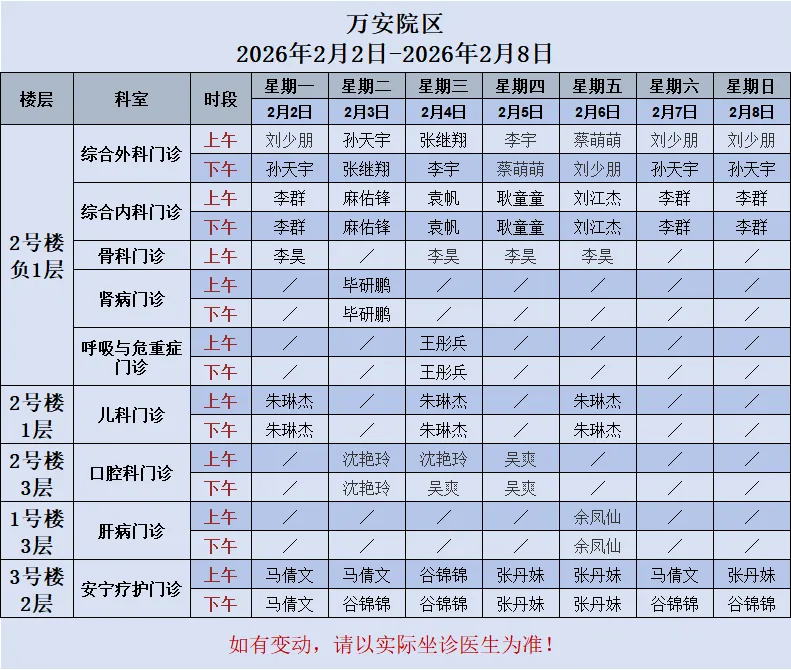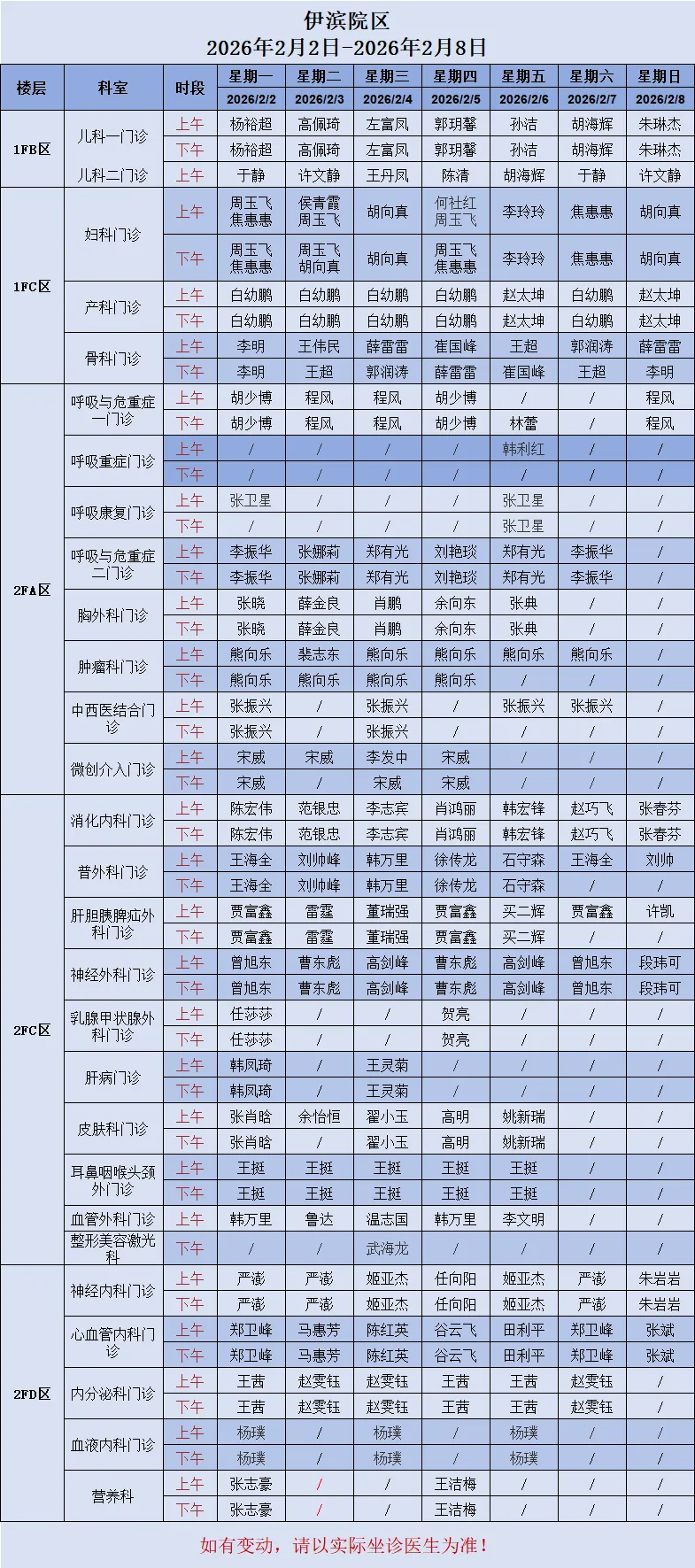 为方便大家合理安排就诊时间,提前规划就医行程,现将我院2026年2月2日至2月8日门诊排班信息进行公示。