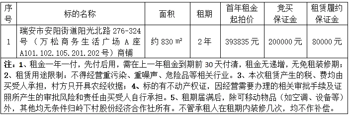 受委托,定于2026年2月10日下午3:00,在瑞安市安福路30号瑞安市农村产权服务中心一楼拍卖大厅,将对以下标的物租赁权进行拍卖,现公告如下: