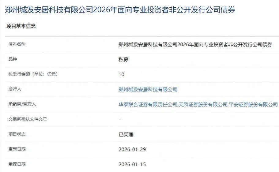 1月30日消息,郑州城发安居科技有限公司2026年面向专业投资者非公开发行公司债券项目已获上交所受理。本期债券拟发行金额10亿元,承销商/管理人为华泰联合证券、天风证券、平安证券。