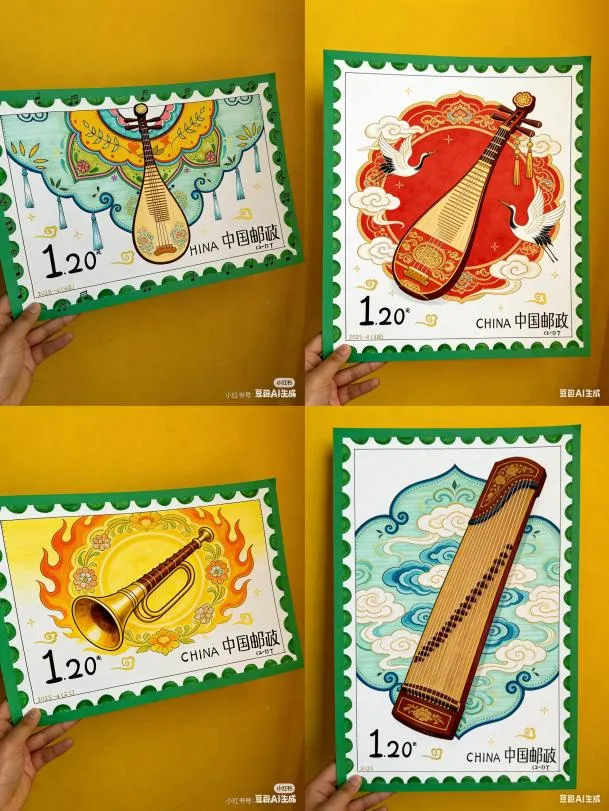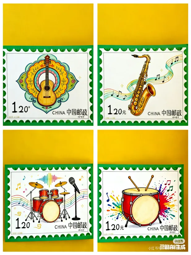 制作步骤:先在8K画纸的规划区域内,用铅笔勾勒出邮票的轮廓,确定齿孔、面值、铭记等基础要素的位置;再围绕“中国传统乐器、西洋乐器、经典音乐符号”等音乐主题,绘制邮票的核心图案,用色彩工具为图案上色,保证画面鲜艳饱满;接着用花边剪或画笔做出邮票的齿孔效果,标注合适的面值(如1.20元、80分)和专属铭记(如“中国少年音乐邮局”);空白区域绘制装饰元素,丰富整体画面的层次感与音乐氛围。