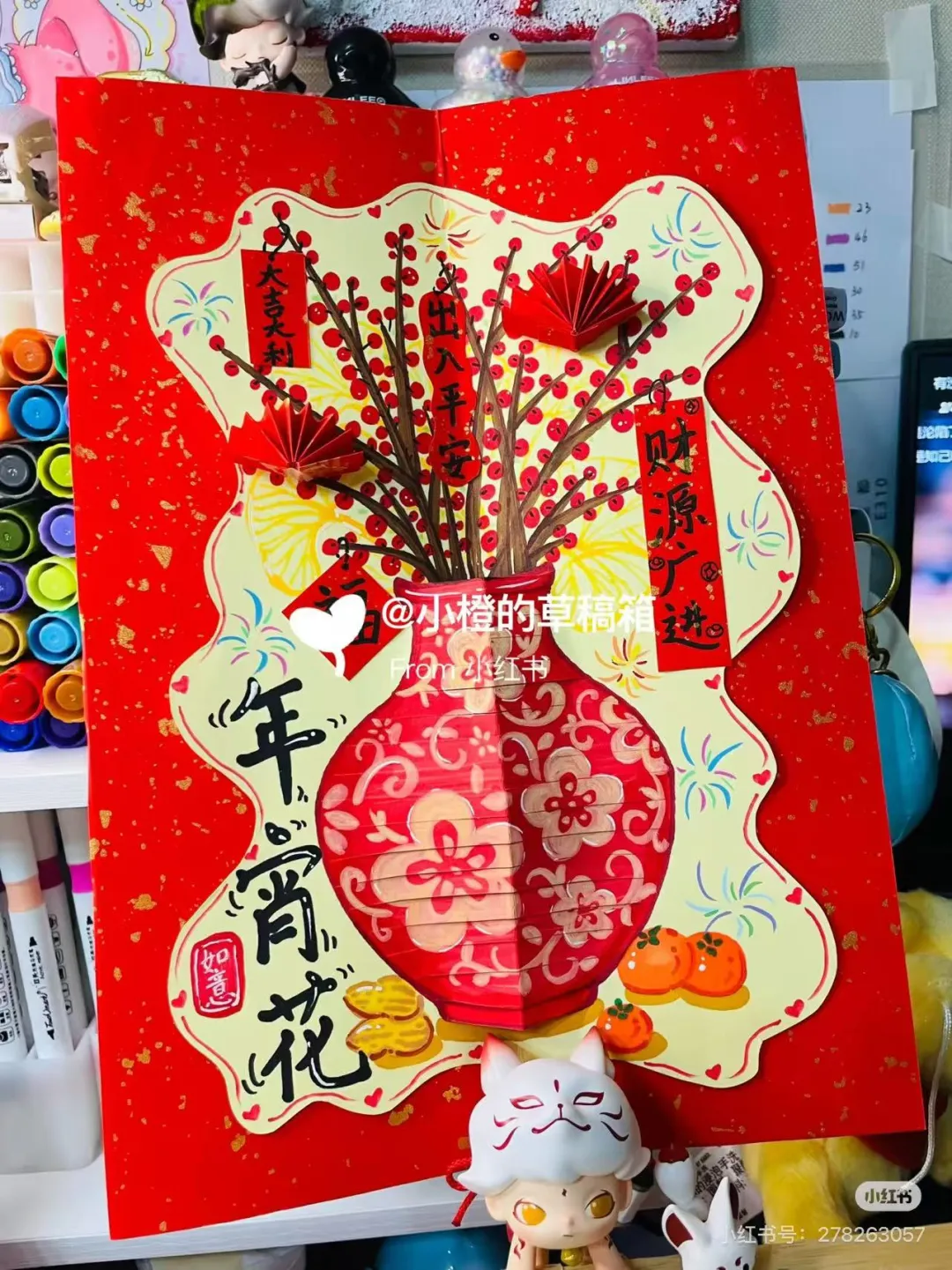 以2026马年年宵花为核心,结合传统新年元素创作8开尺寸的立体拼贴装饰画,展现新年喜庆氛围与传统民俗美学。