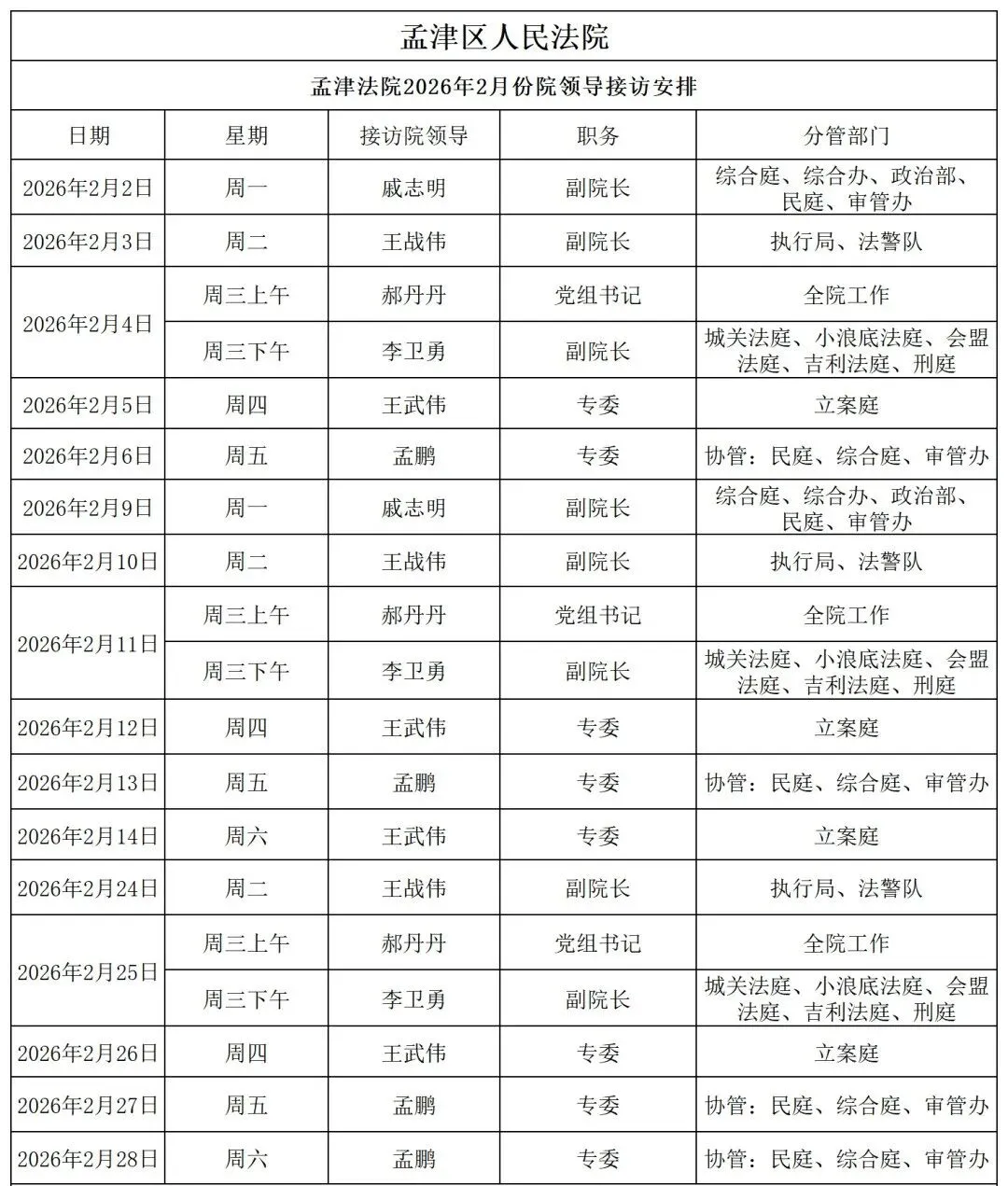 为认真贯彻落实领导干部联系群众工作制度及上级法院要求,进一步畅通群众信访渠道,依法及时就地解决群众合理合法诉求,现将2026年2月份孟津法院接访情况公告如下: