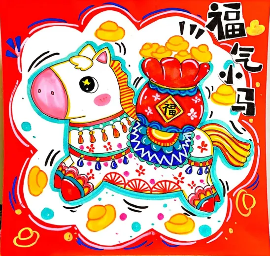 用明亮色彩表现新春喜庆感,画出或剪贴出卡通小马+吉祥元素(福袋、元宝)。给小马添加有装饰感的花纹,让画面既饱满又有细节,同时体现“吉祥寓意”的趣味性。