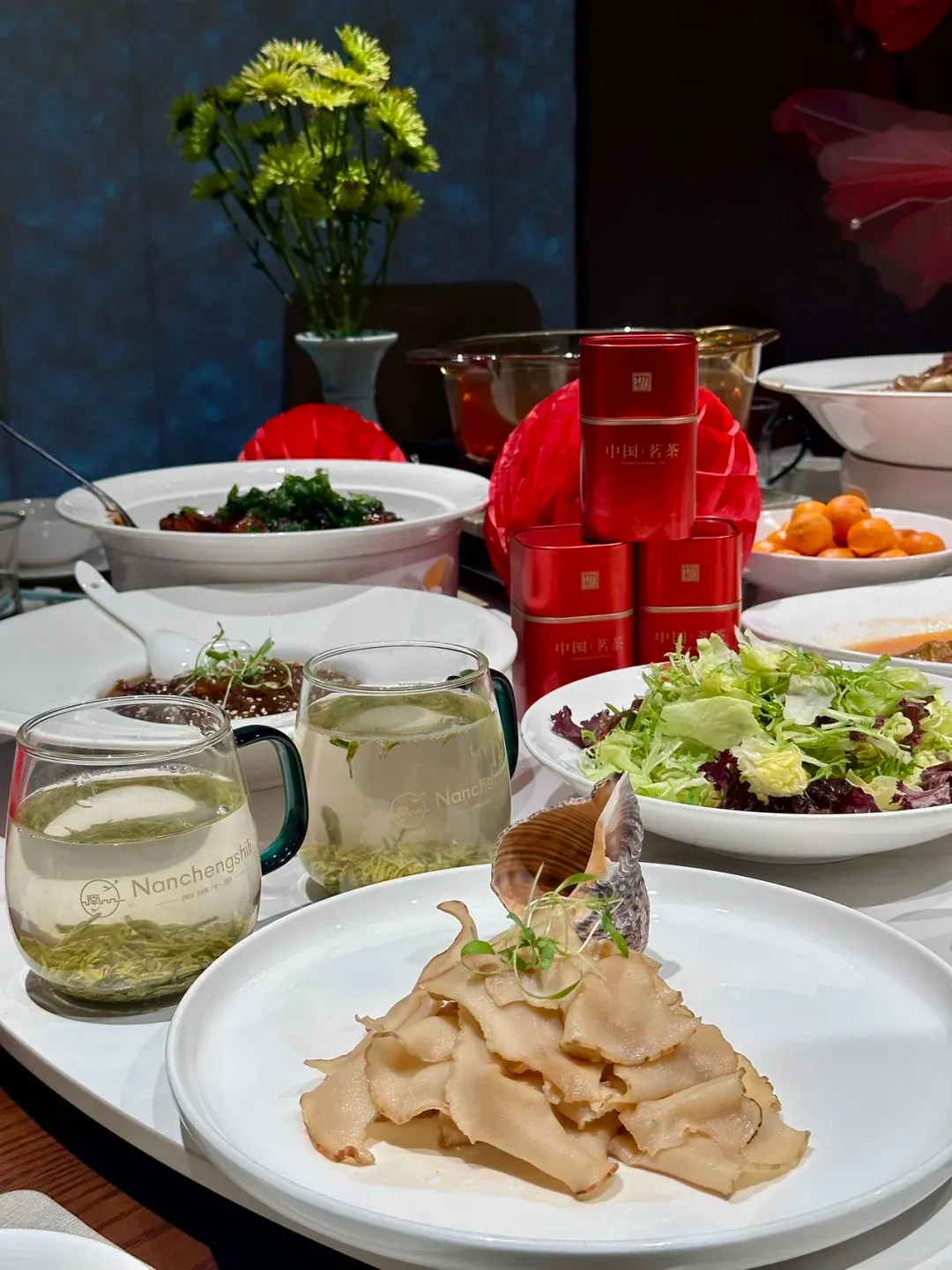 更显诚意的是,预定指定的年夜饭或团建套餐,餐厅竟豪横地准备了核心产区的信阳毛尖作为伴手礼。这份礼物,将餐桌上的余韵延伸,让茶香伴着情谊,持续温暖往后的日子。
