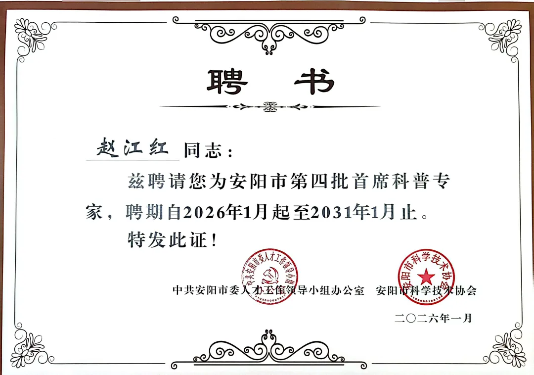 1月28日,市委人才办、市科协公布了第四批安阳市首席科普专家名单,安阳市产品质量检验检测中心主任药师赵江红跻身其列,聘期5年。