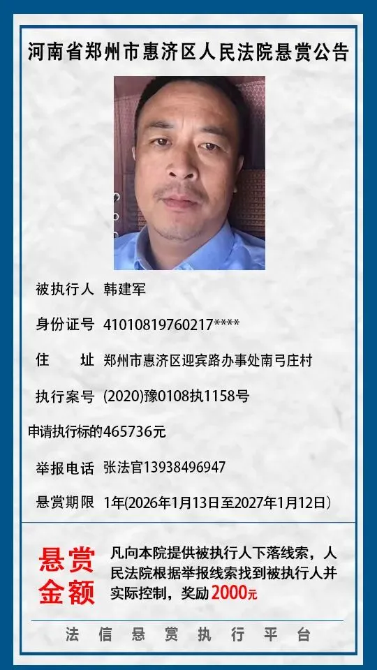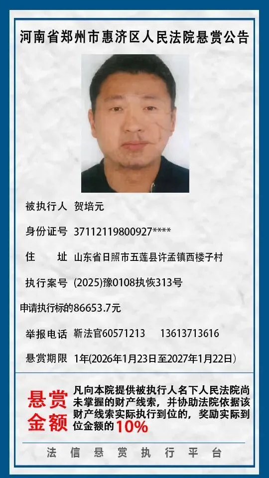 河南省郑州市惠济区人民法院悬赏公告(2026年1月第三期)