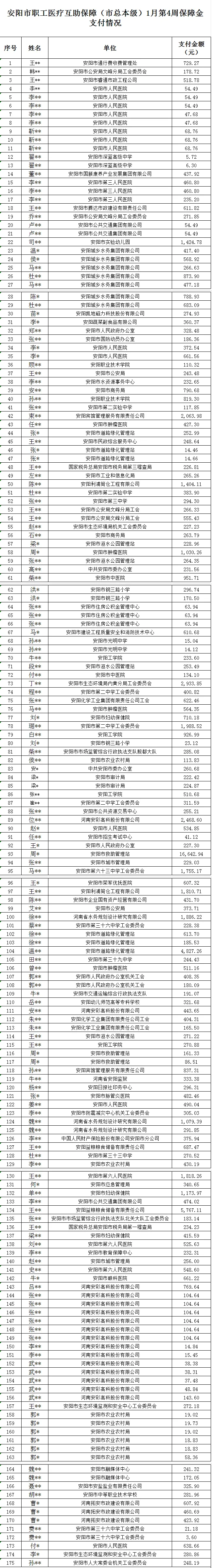 2026年1月第4周(1.23—1.29),安阳市职工医疗互助保障(市总本级)共为130人完成保障金支付申请175笔,支付金额共计97282.33元。具体情况下: