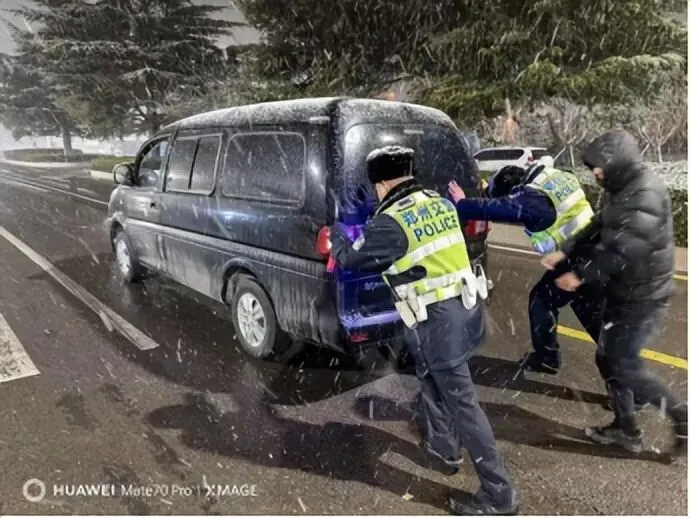 同时加强与气象、城管、环卫等部门的联动协作,提前备好融雪剂、救援车辆等应急物资,同步开展融雪除冰作业。针对雨雪天气路面通行特点,路面执勤民警及时劝导交通违法行为,提醒过往车辆减速慢行、保持安全车距;对因积雪或道路结冰导致的轻微交通事故,快速进行疏导处置,避免拥堵加剧。对受困车辆和群众,主动伸出援手,提供应急救助等暖心服务,守护群众出行平安顺畅。