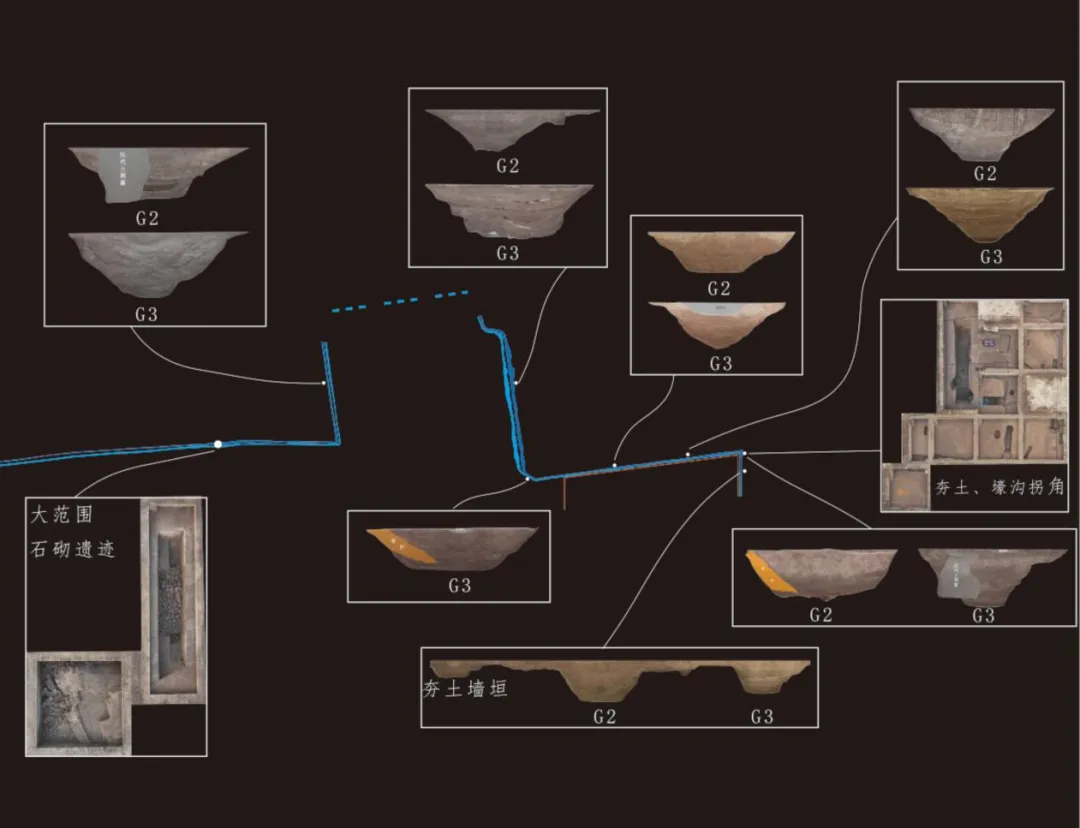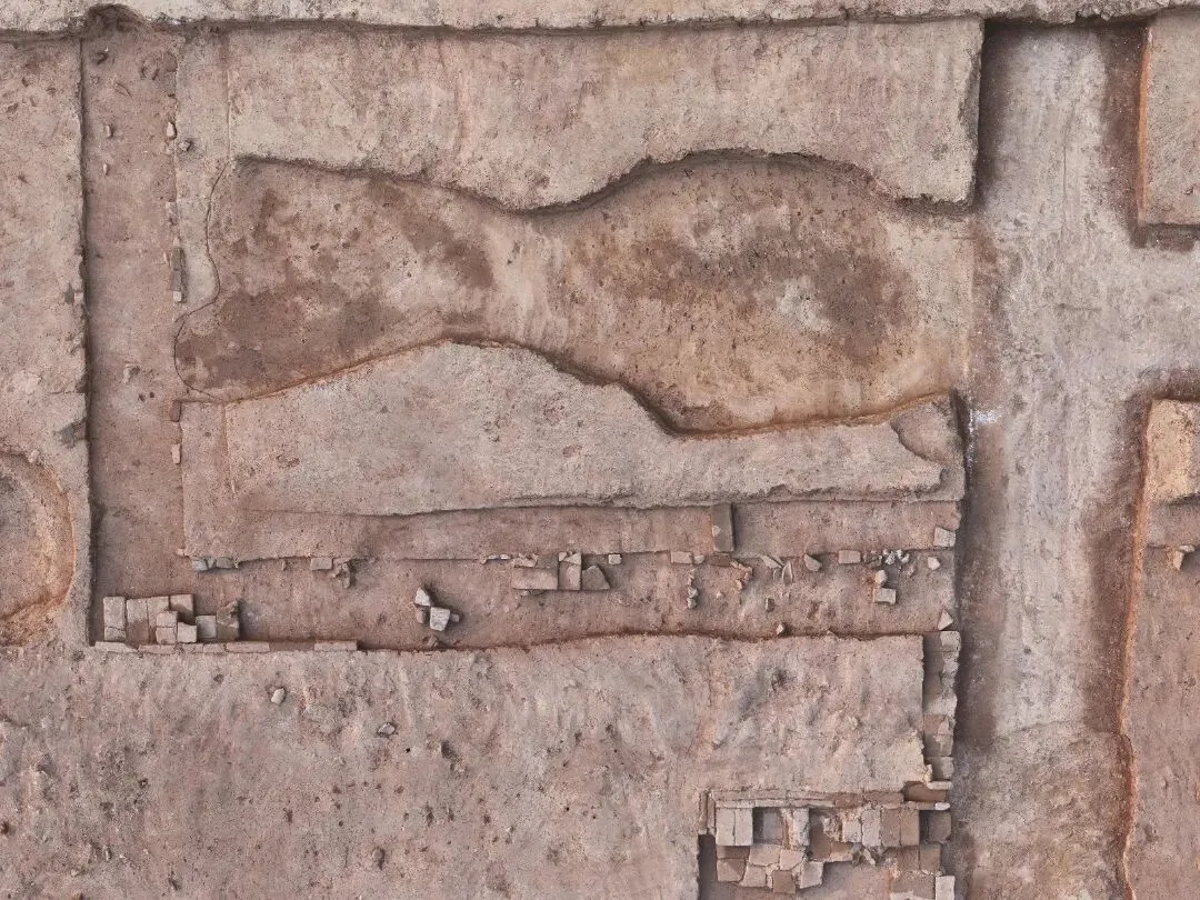 2025年,考古人员在该遗址发现了一段呈“几”字形走向的壕沟,确认该“几”字形壕沟与此前发现的壕沟为同一壕沟系统,兼具防御和水利功能。比如,壕沟沟壁有水流冲刷痕迹,底部发现有水流形成的凹坑;在壕沟一个拐角处,有人工堆筑的堤岸遗迹,部分区域还保留有植物铺垫面;在两条壕沟的西段,发现了排列有序的石砌结构,初步判断属于水利设施遗迹。