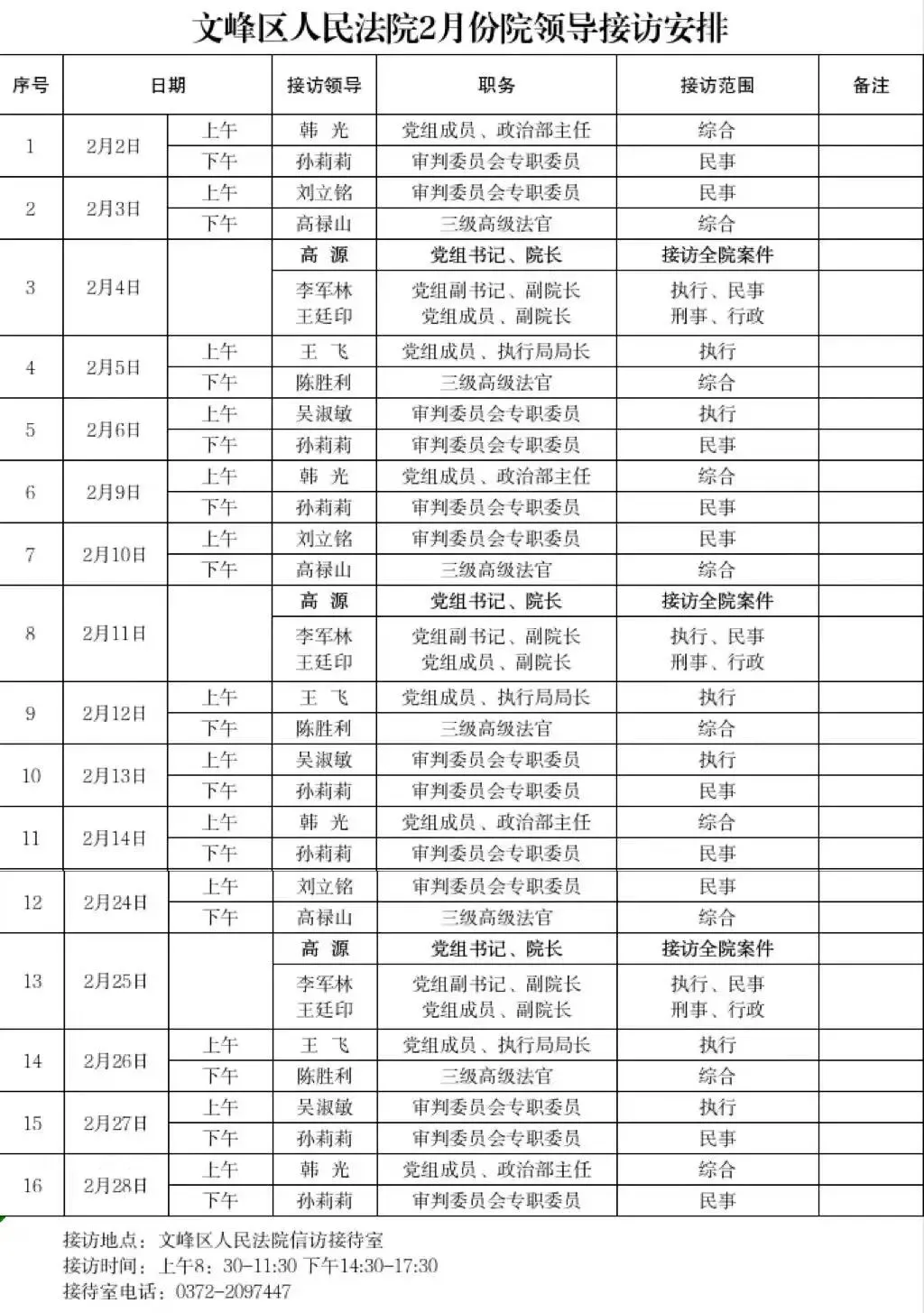 为认真贯彻落实院领导接访制度,进一步畅通群众信访渠道,依法及时解决群众合理合法诉求,现将安阳市文峰区人民法院2026年2月领导接访信息公示如下: