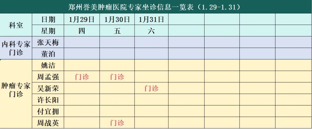 【本周专家预告】郑州誉美肿瘤医院1月29日-1月31日专家坐诊安排来啦!