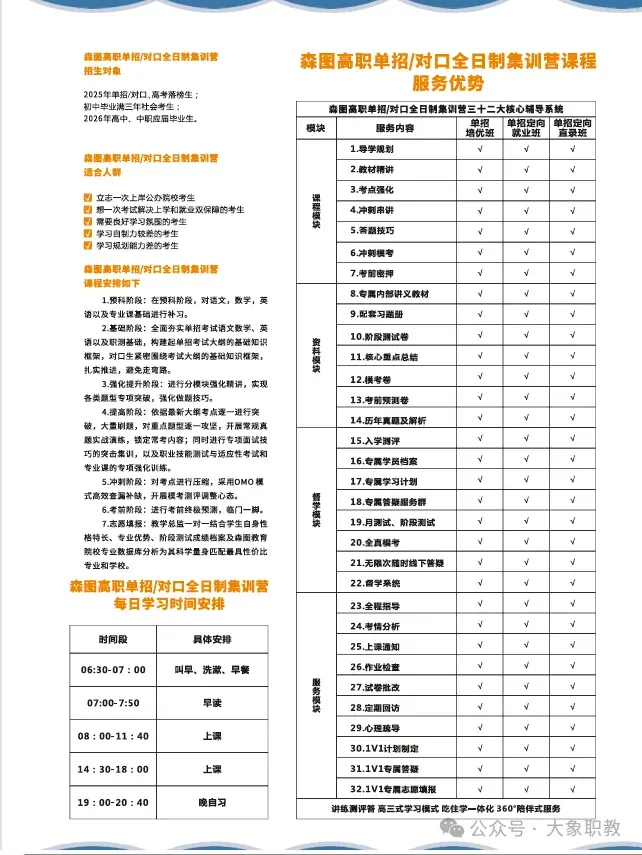 在森图教育对口/单招培训课程中,我们将提供全面而系统的知识讲解,涵盖语文、数学、英语等基础学科,以及专业技能的基础强化提升冲刺密押技巧的课程培训。通过丰富多样的教学方法,激发你的学习兴趣,提高你的学习能力。同时,为了让你更好地适应考试环境,我们还会组织大量模拟考试和实战演练,让你在真正的考场上能够从容应对,发挥出自己最佳水平。