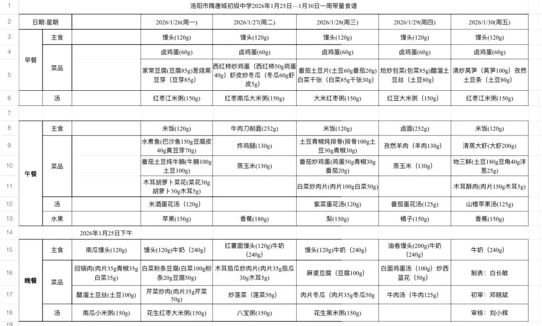 为了保证在校师生每日营养摄入量,洛阳市隋唐成初级中学严格按照每日的膳食推荐摄入量为师生们制定了食谱,让师生们的每一餐都吃的营养,吃的健康,吃的安心!