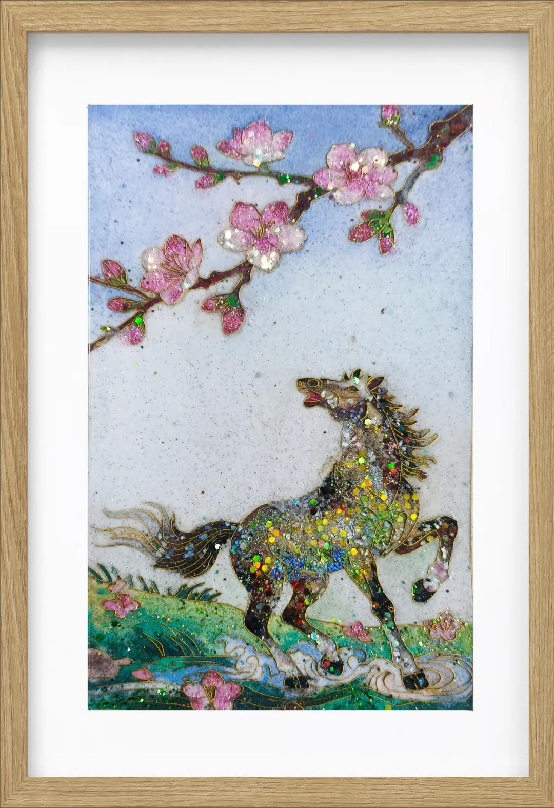 五月石榴花热烈绽放,寓意多子多福、生命蓬勃;汗血宝马驰骋千里,象征开拓进取的力量。通过意象叠加,将石榴花的生命绽放与汗血宝马的驰骋力量熔铸于金属与矿物釉料的交响中,双重寓意交织,尽显生命之美与奋进之志。