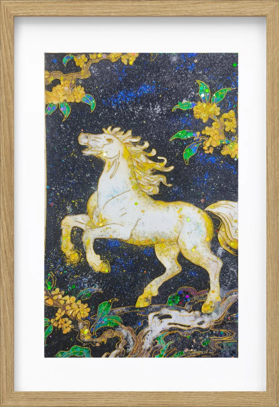 八月桂花飘香,月色皎洁;唐玄宗的御马照夜白,身姿俊朗,自带仙逸之气。黑色底胎上,螺钿碎贝铺就星空背景,鎏金掐丝的白马昂首嘶鸣,金色桂花以点螺工艺呈现,仿佛月光下洒落的碎金,完美诠释“香随马,月照夜” 的千年风雅,融合盛唐的华美与仙逸。
