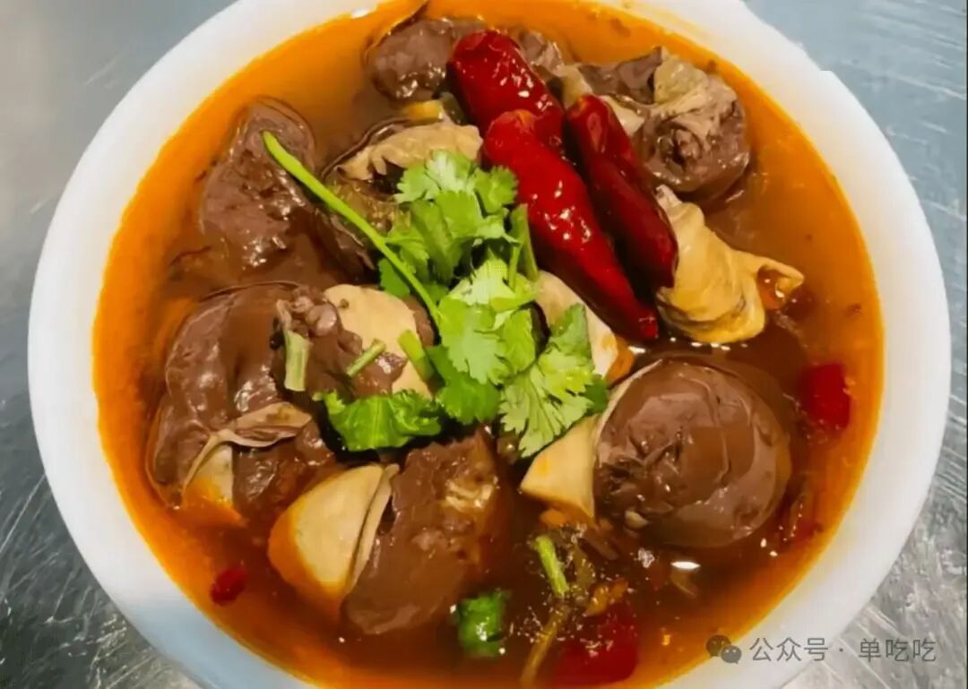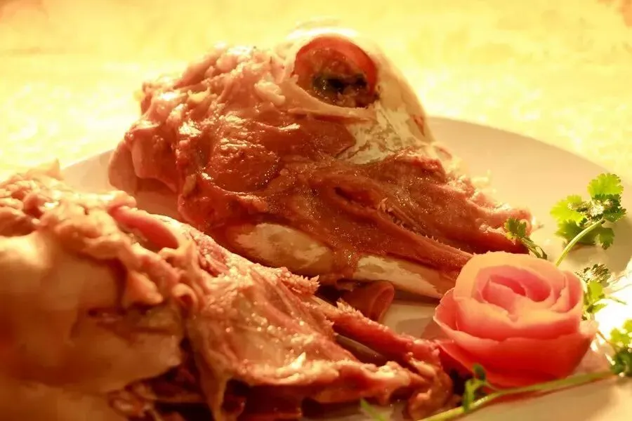 最后登场的是豫北名吃中的“硬菜担当”——东庄羊头。它以“羊脸软糯、羊舌弹牙、羊眼晶亮”的多层次口感闻名,更因“吃羊脸是面子,吃羊眼是眼界”的民间俗语,成为当地宴席节庆的头牌菜。其核心魅力在于沙地土山羊的本味、14味香料的精准配伍,以及“清而不寡、鲜而不膻”的炖煮技艺。炖好的羊头形态完整,羊脸表皮透亮、软糯黏唇,羊舌弹嫩回甘,羊眼半透明状、轻咬即化。搭配一碗加了香菜、蒜苗的热汤,先喝汤暖胃,再逐味品尝,胶质满满、营养滋补,难怪当地人常说“一碗羊头汤,胜过参汤补”。
