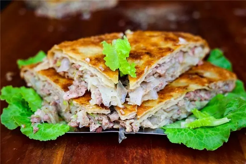 接下来是承载着状元佳话的梁庄壮馍。这道有着近300年历史的传统小吃,又称“状馍”,相传古时梁庄书生上京赶考中得状元,将自家制做的面饼呈于御宴,皇帝品尝后赞不绝口:“入口焦中有绵,酥中有咸,脆中有甜,味道多感。烤色金黄象征前程似锦,状元食的馍就叫状馍吧!” 其制作颇有讲究,猪腿肉、大葱、粉皮调成馅料,包入擀成长条的面片,刷油后擀成圆饼,入油锅煎至金黄。成品外酥里嫩、皮薄馅大,咬下时油香与肉香迸发,咸鲜适口,是内黄人节庆宴席与日常解馋的心头好。