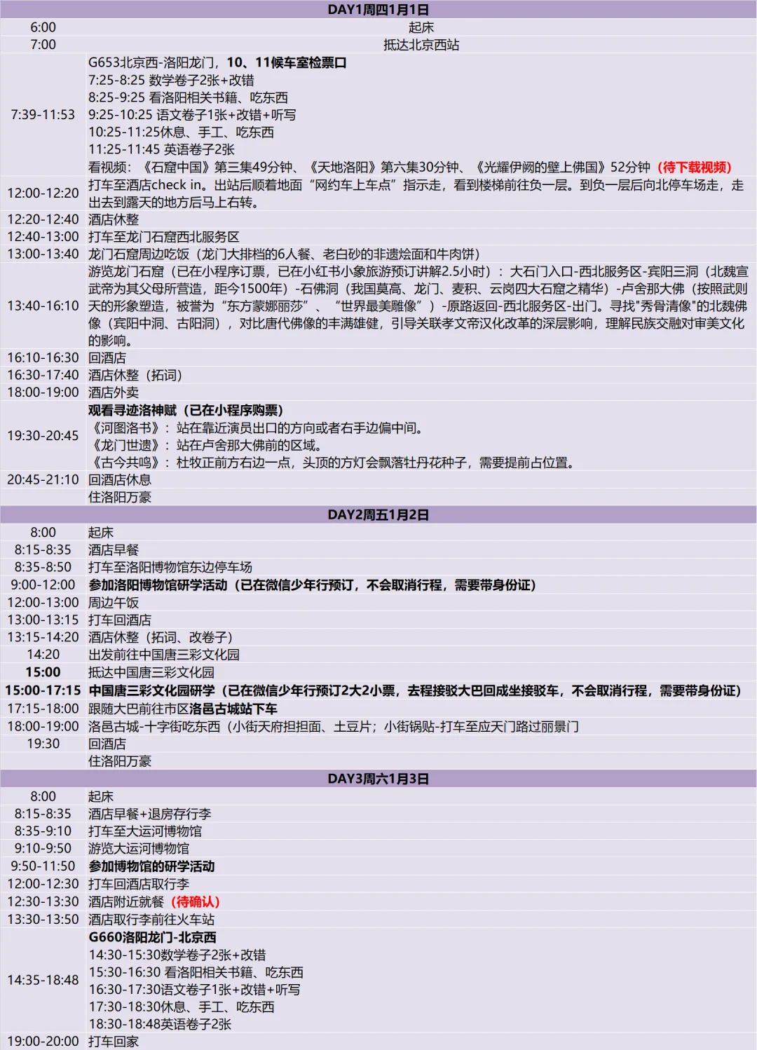 出发之前我做了详细的攻略,也邀请了好朋友一家,在此也特别感谢朋友一家的大力支持与帮助。我们计划早上的火车出发,约中午到达洛阳。因为节后就要进行四下的期末考试,所以路上4个小时的车程我准备了一个小时学习一个小时休息的计划,休息时间给小柔和她的好朋友准备了洛阳的好奇号、洛阳的绘本及一些研学材料。我的朋友准备了洛阳的视频,包括《石窟中国》第三集、《天地洛阳》第六集以及一些石窟和石雕的素材。同时因为洛阳是十三朝古都, 我们也准备了一些历史素材,包括小朋友喜欢看的“历史八卦”。