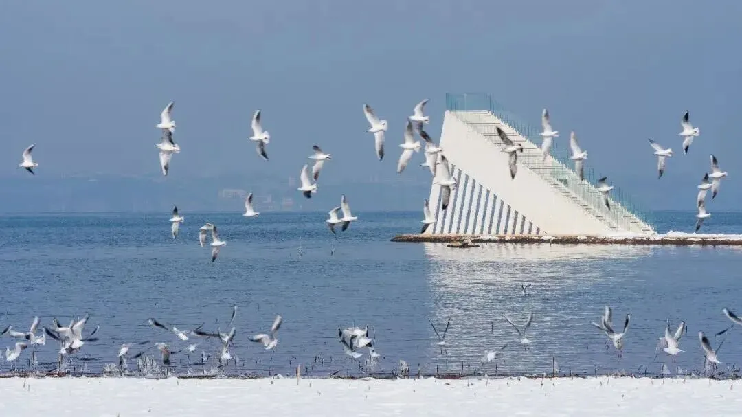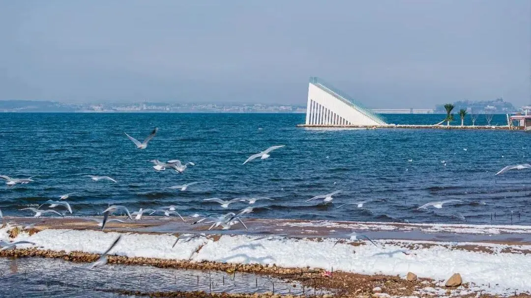 与岸边的白雪融为一体