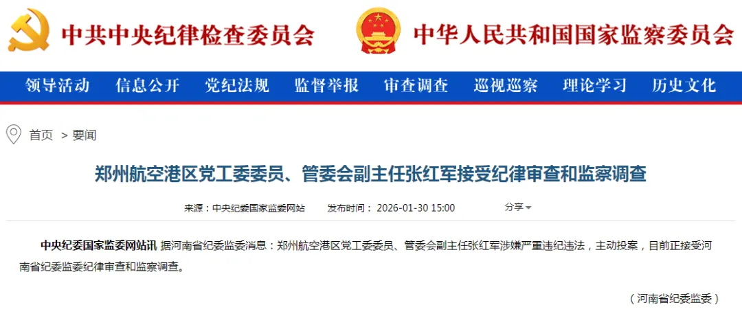2026年1月,张红军涉嫌严重违纪违法,主动投案,接受河南省纪委监委纪律审查和监察调查。
