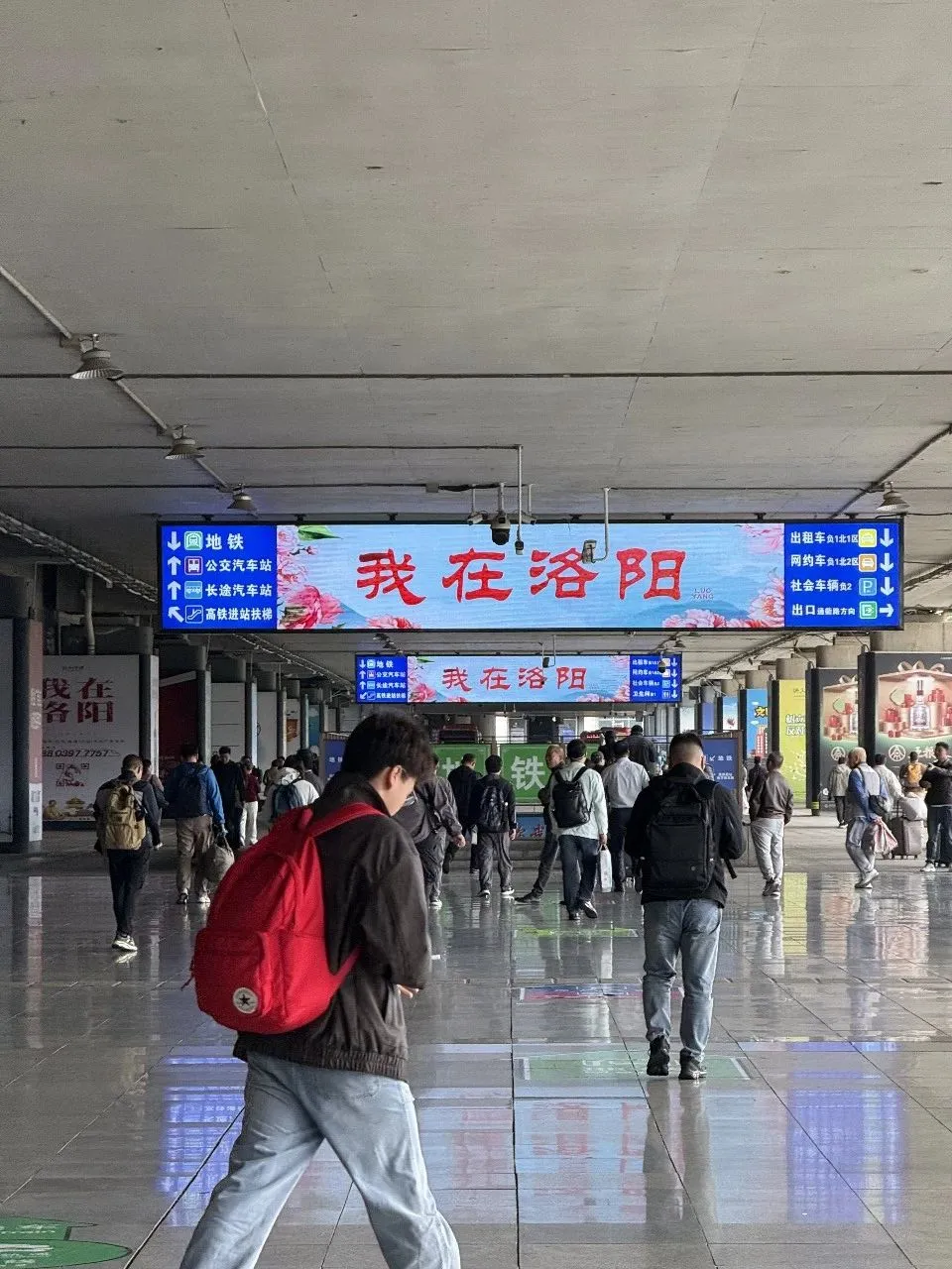 跟着箭头走,直走去搭乘城际列车,到郑州东坐高铁去洛阳。