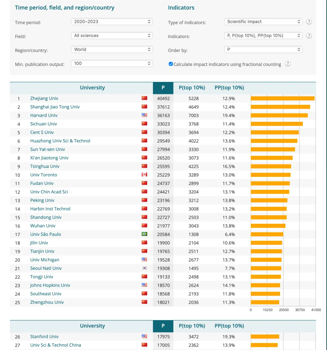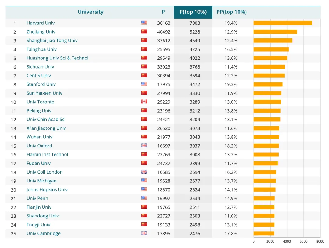 当然,只看论文数量其实很难说明大学的学术水平究竟如何。如果想进一步了解各个大学的排名情况,这个大学排名提供了3个可选排名参数,分别是P、P(top 10%)和PP(top 10%),它们分别对应2020年到2023年大学发表的论文数量,领域内前10%的论文数量和领域内前10%论文的数量占本大学发表论文数量的比例。