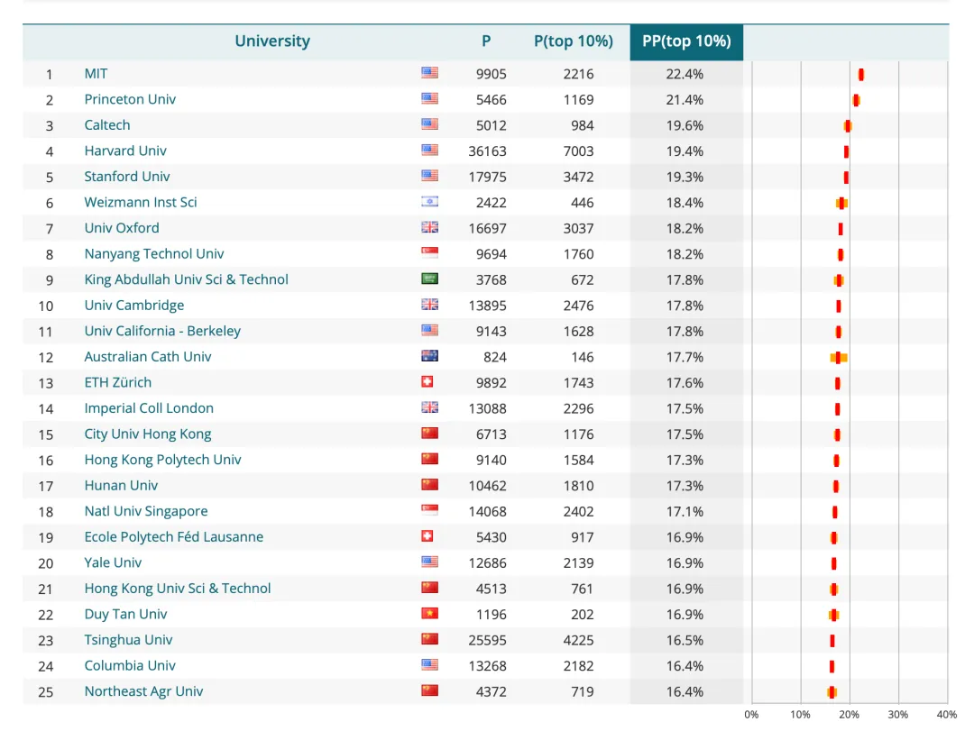 如果将排名参数改为PP(top 10%),也就是按照领域内前10%论文的数量占比排名,那么前三名分别是美国麻省理工学院、普林斯顿大学和加州理工学院。排名前10没有中国大学,排名前25也只有6所大学。中国大学排名最高的是香港城市大学,内地排名最高的是湖南大学。清华大学位于第23名,北京大学位于第102名。