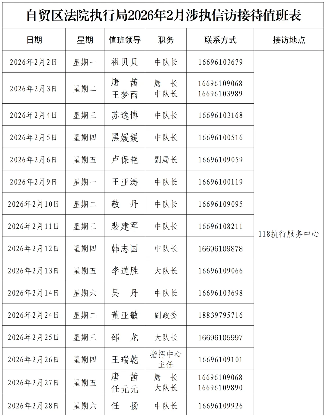 为切实提升人民群众对执行工作的满意度和获得感,及时发现并解决人民群众在执行领域急难愁盼问题,畅通案件当事人诉求反映渠道,强化执行公开力度,现将河南自由贸易试验区郑州片区人民法院执行局2月份执行信访值班表公示如下: