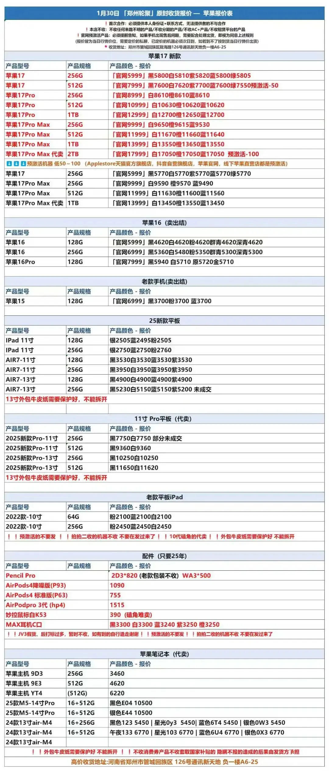 >郑州轮聚通讯 2026年1.30日数码报价更新