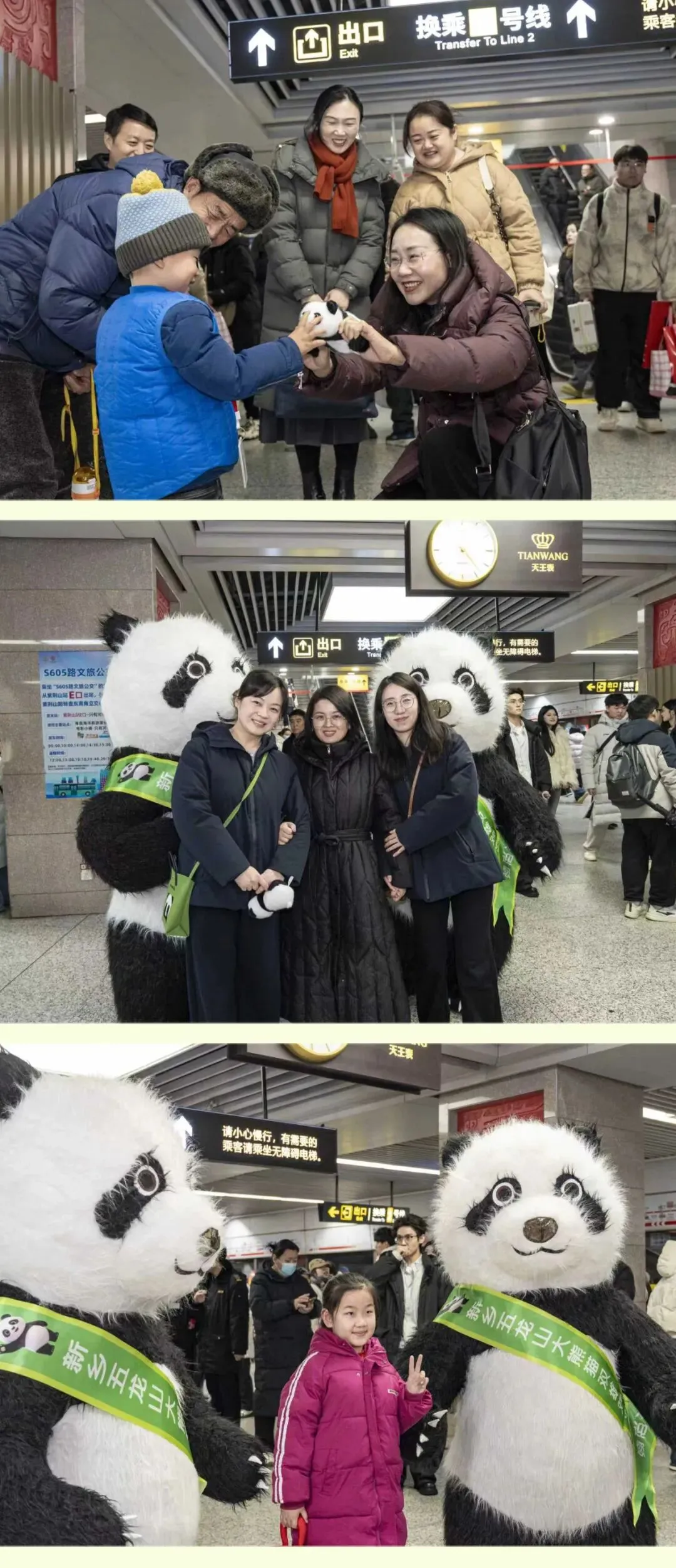 活动现场,大熊猫“娇奥”“双雄”“灵岩”“迈迈”视频在站厅屏幕滚动播放,工作人员身着熊猫玩偶服装,跳起憨态可掬的“熊猫舞”,吸引众多市民驻足互动与合影。
