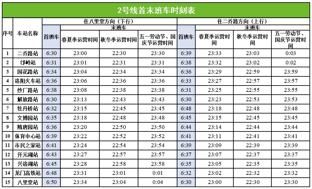 为持续优化运输资源配置,提升轨道交通服务效能,洛阳地铁自2026年2月1日起对线网运输组织进行调整。调整后线网执行春夏季和秋冬季运营时间,春夏季运营时间为6:30~23:00,秋冬季运营时间为6:30~22:30,五一劳动节和国庆节假期期间运营时间为6:30~23:30,元旦、春节、清明节、端午节、中秋节假期期间运营时间为6:30~23:00。具体行车安排如下表,调整后的首末班车时间详见附件。请广大乘客提前做好出行规划。