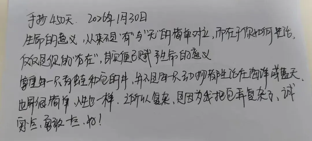 这是我坚持手抄的第450天,刚开始抄写的早安语录,后来改为心理知识手抄,不知不觉就抄写一年多了。也没有觉得坚持的很辛苦,每天大约需要10分钟左右的时间。