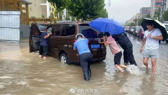 车辆被淹熄火,众人一起推车