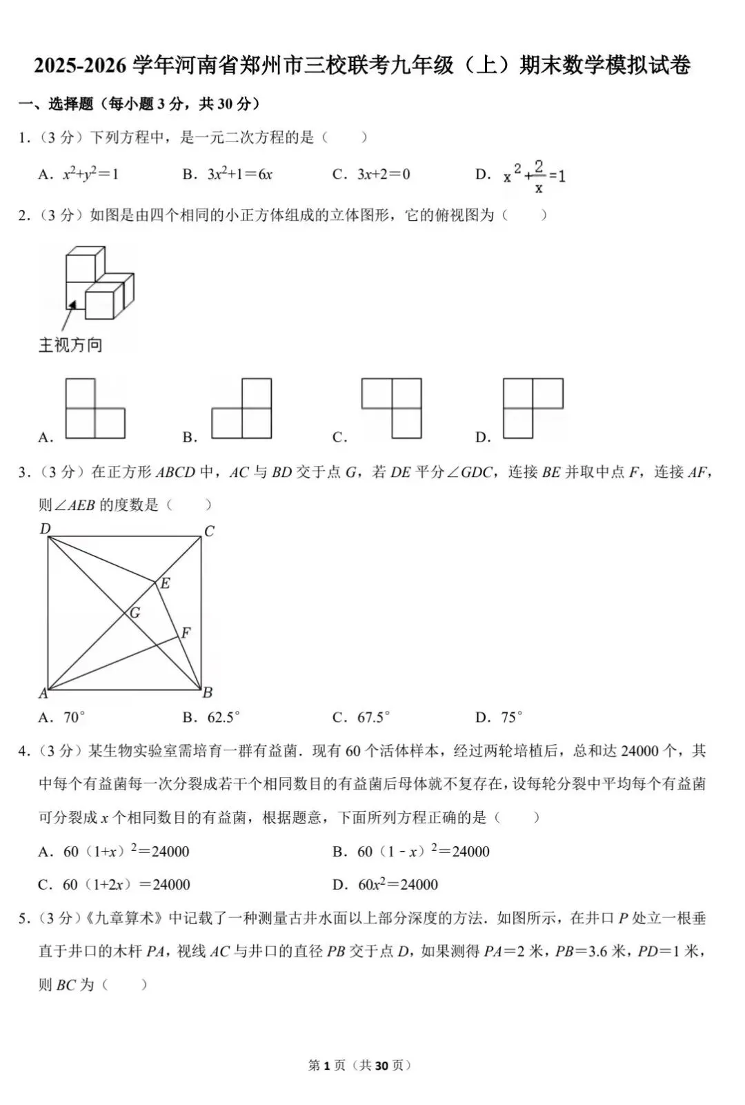 当前位置:首页>郑州>【三校联考】2026年河南省郑州市初中九年级上学期“期末"三校联考《数学》试卷